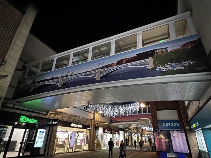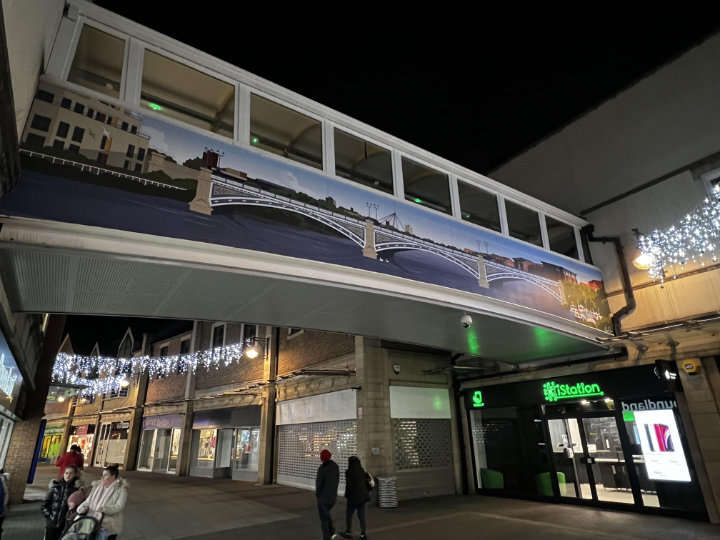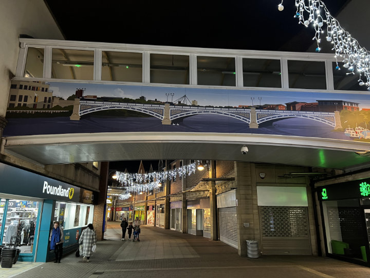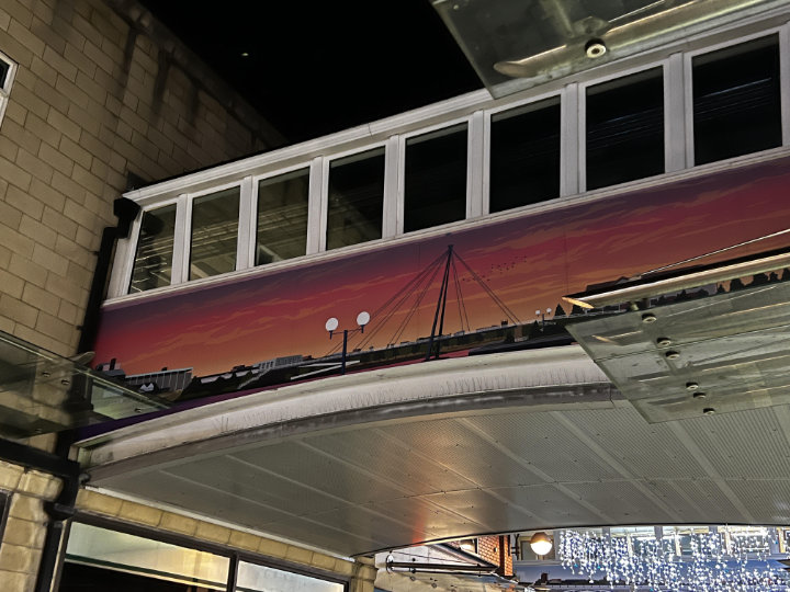 I think it would be safe to say that this was the most difficult job Ark Display Graphics ever undertaken. These bridges are in the main shopping precinct in Stockton upon tees, they have been there for many years on the cladding was beginning to show its age. The idea was to plywood the exterior and then for us to vinyl wrap the bridge.